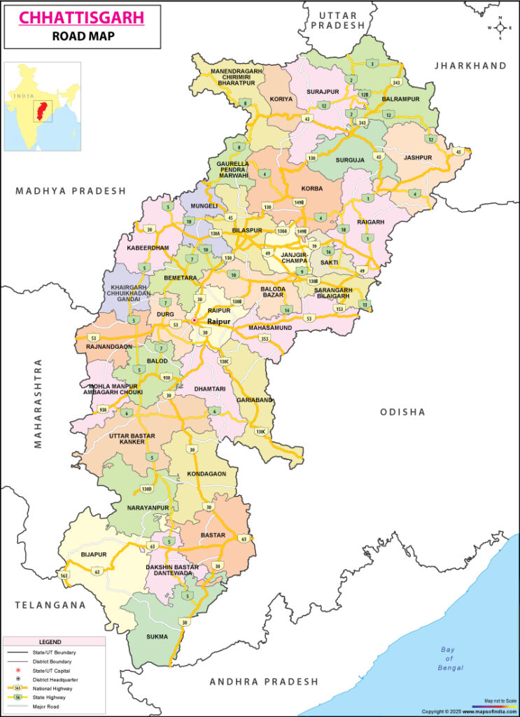 Chhattisgarh is a central Indian state known for its rich natural resources, dense forests, and vibrant tribal culture. Formed in the year 2000 after being separated from Madhya Pradesh, it is bordered by states such as Odisha, Maharashtra, Telangana, and Uttar Pradesh. The state capital, Raipur, is a major commercial and administrative center. Chhattisgarh is one of India’s leading producers of minerals like coal, iron ore, and bauxite, which play a vital role in the country’s industrial growth. Agriculture is also an important occupation, with rice being the main crop, earning the state the title “Rice Bowl of Central India.”