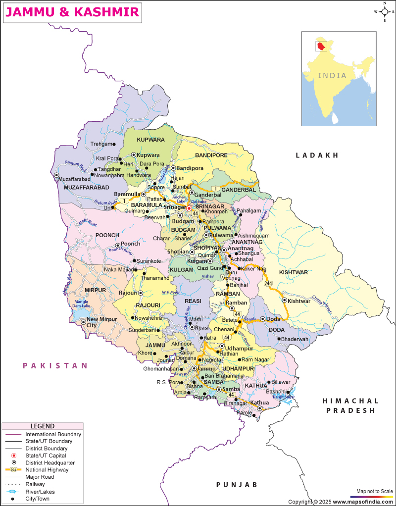 Jammu and Kashmir is a picturesque region in northern India, renowned for its breathtaking landscapes, snow-capped mountains, lush valleys, and serene lakes. The territory is geographically divided into three main regions—Jammu, the Kashmir Valley, and parts of Ladakh (historically)—each offering distinct topography and cultural influences. The Kashmir Valley is especially famous for its natural beauty, including Dal Lake, Mughal gardens, and expansive apple orchards, while Jammu is known for its plains, hills, and important pilgrimage sites. The region experiences diverse climatic conditions, ranging from hot summers in Jammu to cold, snowy winters in the Kashmir Valley.